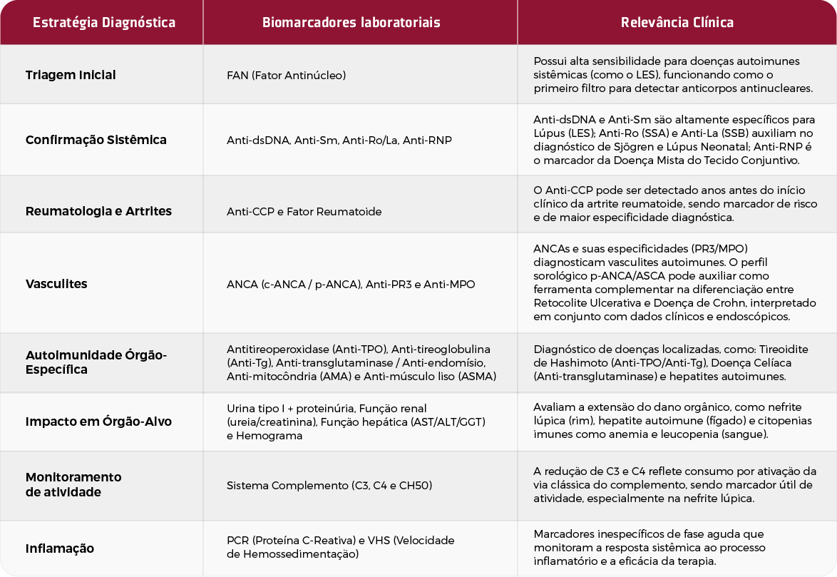 Os exames e condições citados não contemplam todo o espectro das doenças autoimunes nem todos os testes disponíveis. Por se tratar de um campo amplo e complexo, os resultados não devem ser interpretados isoladamente, sendo indispensável o acompanhamento médico especializado para correlacionar exames, quadro clínico e histórico do paciente, garantindo diagnóstico e tratamento adequados.